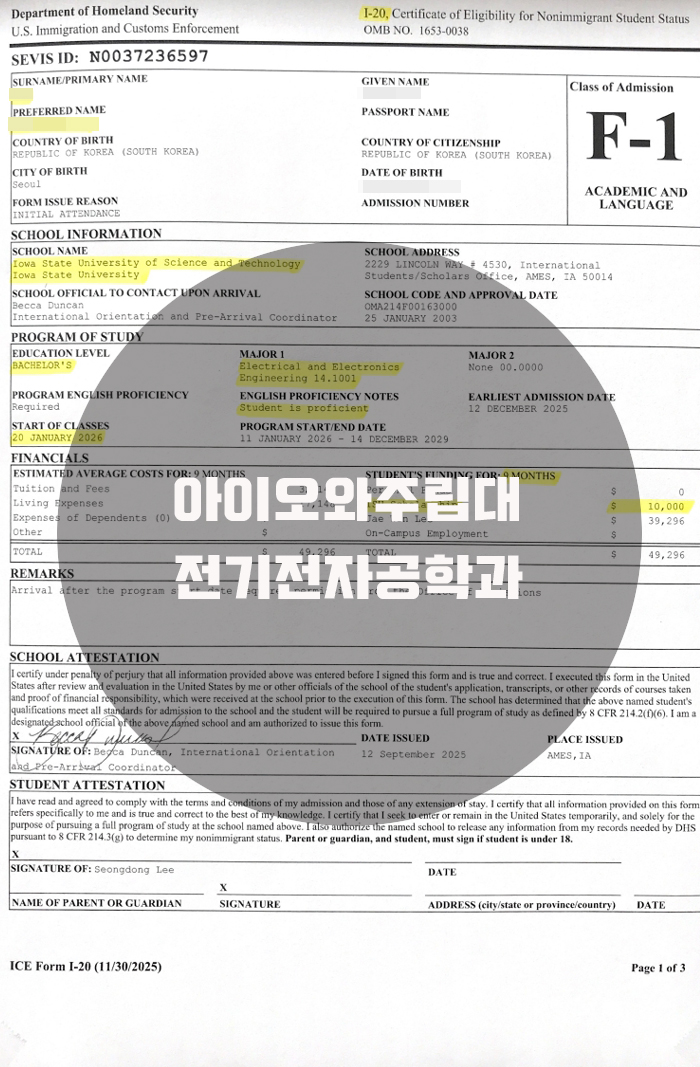 아이오와주립대 입학허가서