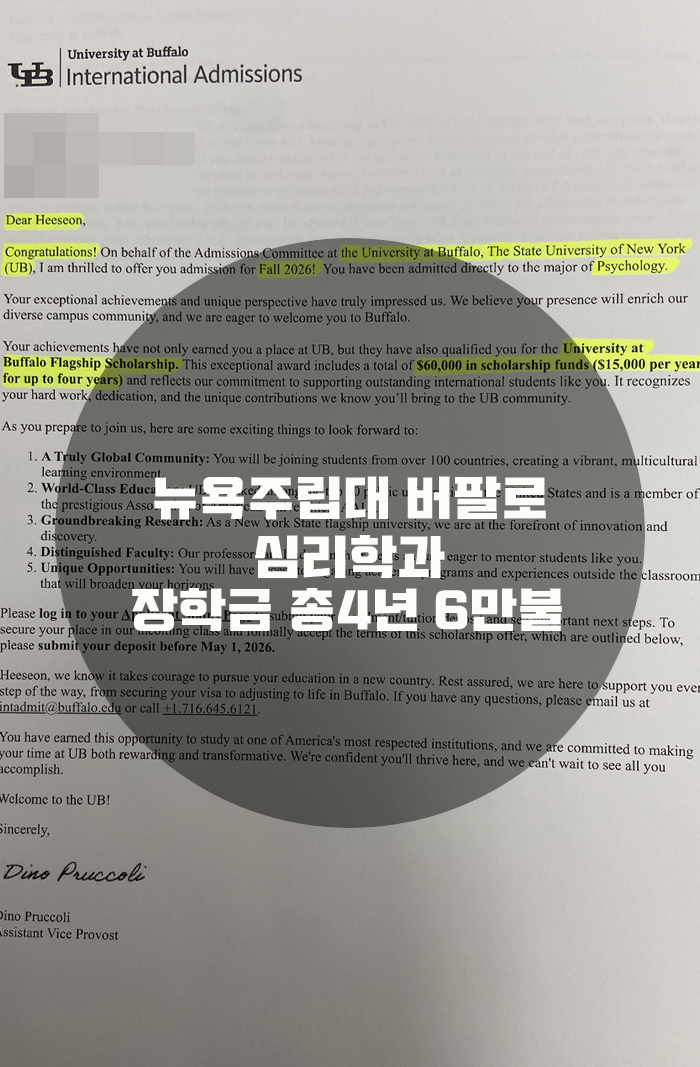 뉴욕주립대 버팔로 장학금 1년 15,000불씩 총 6만불