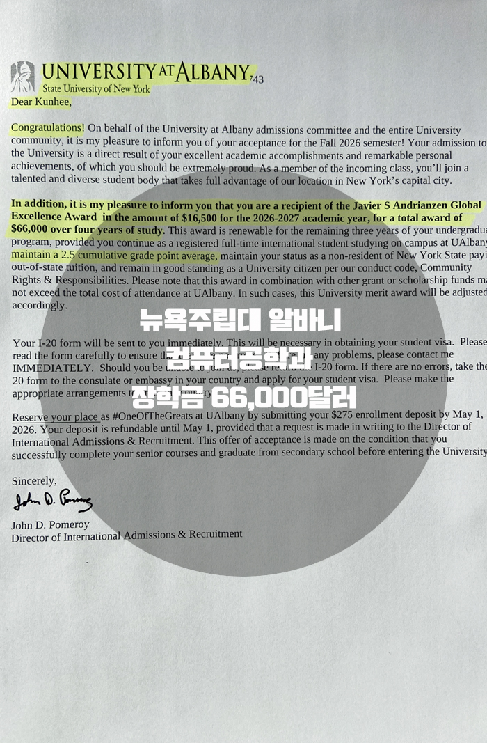 뉴욕주립대 알바니 컴퓨터공학과 전액장학생